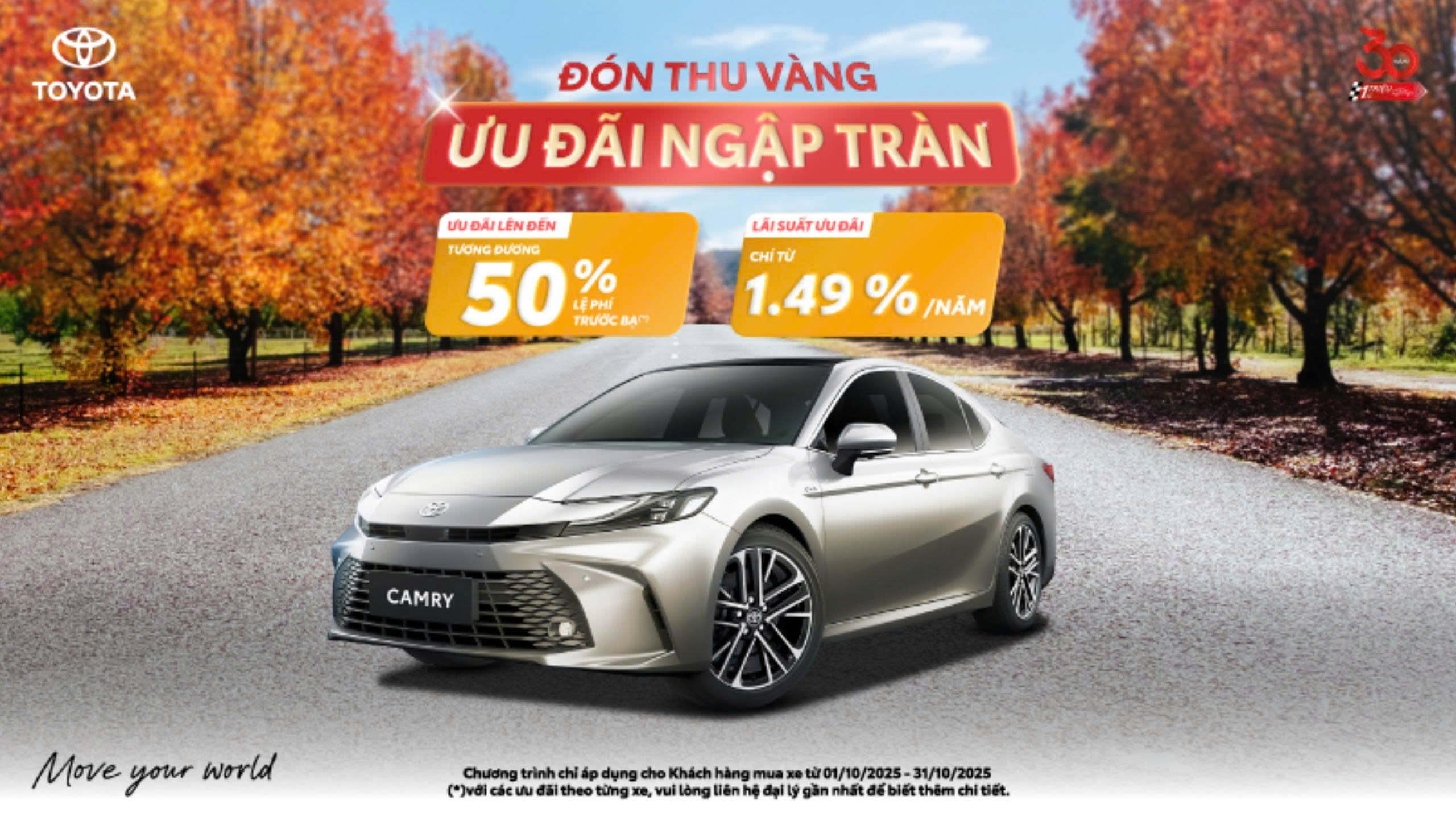 Tháng 10 này, Toyota Hưng Thịnh Phát Thái Bình triển khai chương trình “ĐÓN THU VÀNG – ƯU ĐÃI NGẬP TRÀN” dành riêng cho khách hàng mua Camry 2025: